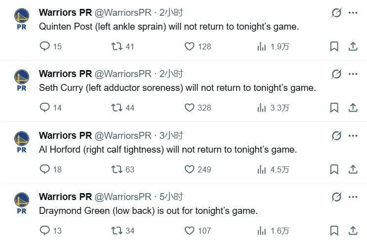 勇士下一场打尼克斯的伤病名单也出来了——