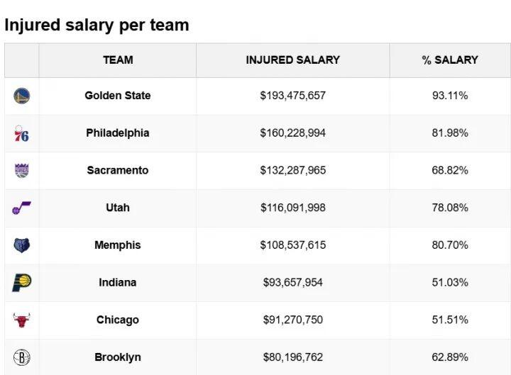 一项冷冰冰的统计, 勇士目前的伤员薪水已经达到了1.93亿美元,占全队工资的93.11%,两个数字都是高居联盟第一