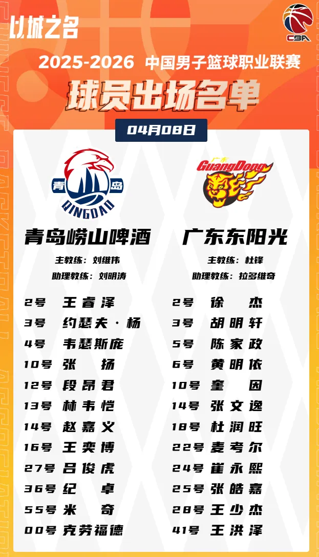 虎扑04月08日讯 今晚CBA常规赛,青岛对阵广东的大名单已经公布。